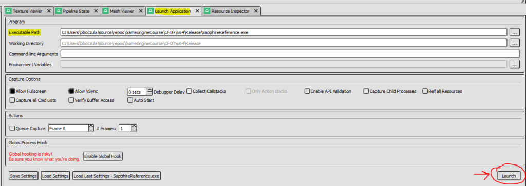 In order to start recording, select the Launch Application and then in the Executable Path find the exe file of our engine. For now, let’s leave all the other options alone and then click the Launch button.