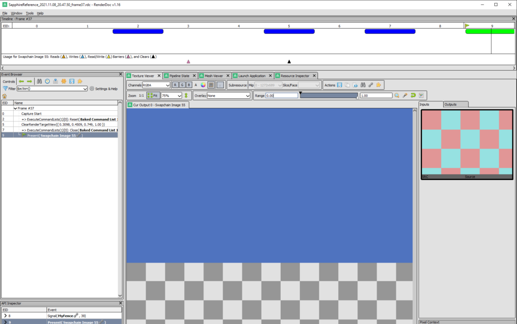 For example, when we click the command with EID 5, ClearRenderTargetView, in the API Inspector we see that prior to that, we called the ResourceBarrier() function and the OMSetRenderTargets() functions. The similar information, but in different format, can be seen on top of the window in the Timeline section. The actionable commands have a corresponding “button” that you can click. And this is the basics of working with RenderDoc. Don’t worry, we will be looking at this tool a lot in the near future.
