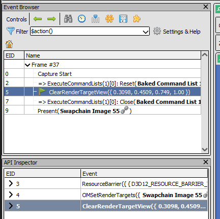 Event Browser, along with the API Inspector shows every command on the Command List, along with some additional information. Each command has its own EID. In the Event Browser we can only see the actions that are important from the rendering perspective, commands that actually change something like draw something on the screen. When you click on that action, in the API Inspector you can see all the commands that lead to that action.