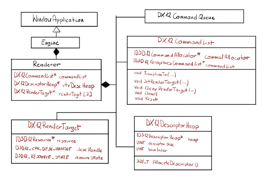 Then we have added two new classes: DX12RenderTarget and DX12DescriptorHeap. The first one will for now keep all the necessary information, so when we pass this to the DX12CommandList, it will have all the necessary data to set it as a Render Target. The DX12DescriptorHeap will manage a heap of small structures called descriptors, that contain all the necessary information about the resource.