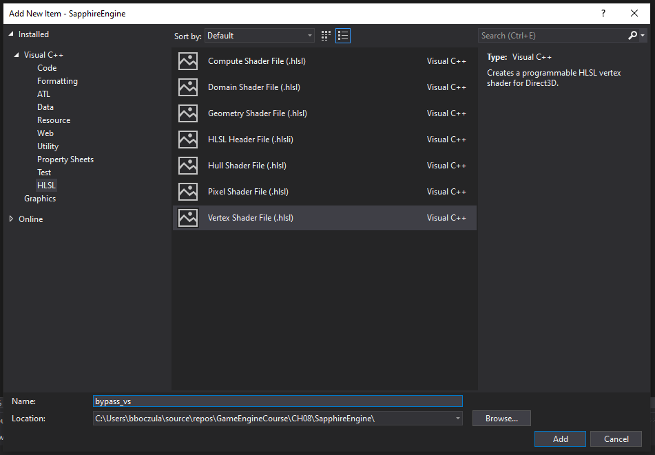 Then, from the tree on the left, click the “HLSL” category. From the middle section, pick “Vertex Shader file”. Next, you have to type the new file name. Since our shader will do nothing except bypassing values to the Pixel Shader, let’s call it “bypass_vs”. Finally, click “Add” and there you go, a shiny new pixel shader. And it already has some basic HLSL code in it, which is great.