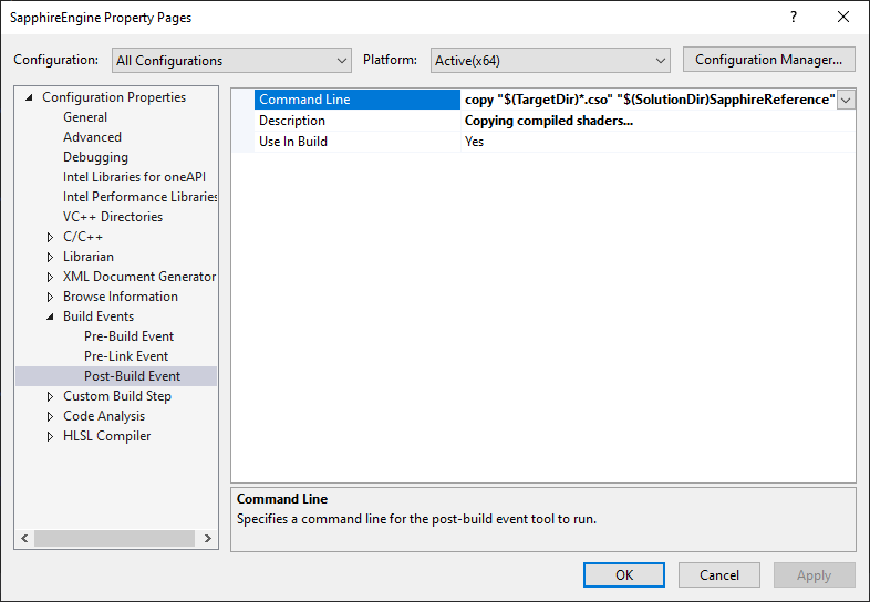 There are two variables that we are using here, the TargetDir, which resolves to the folder where executable is, and the SolutionDir, which is the folder that contains both of our projects. We now simply use the copy command to copy all CSO files to the SapphireReference directory, which will allow us to successfully run the executable without necessity to leave Visual Studio environment.
