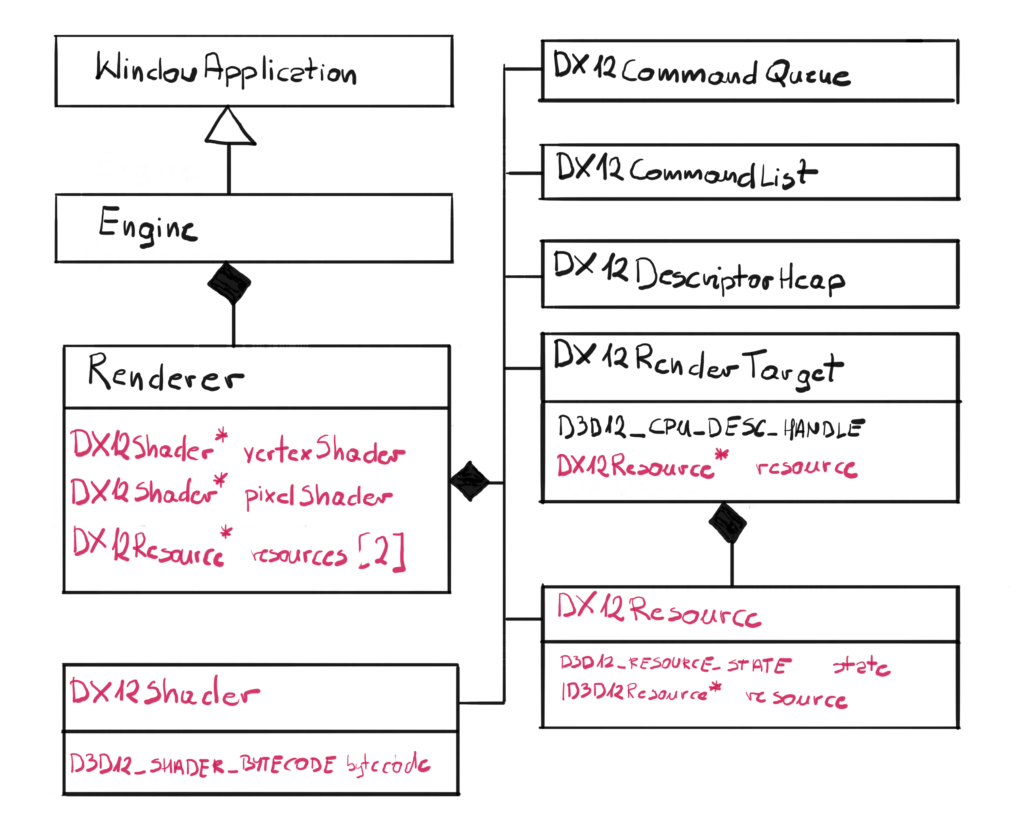 Starting from the biggest class – the Render is getting three new members: two shaders and an array of two resources. I decided to create one more layer of abstraction, since I didn’t want Render Target to wrap around the raw Resource pointer. On top of that, we obviously have two new classes. DX12Shader will simply read in the compiled shader data and store it for later. The DX12Resource will be responsible for either creating or getting external resource and keeping the state information within. The pointer to the underlying Resource has also been added to the DX12RenderTarget class.