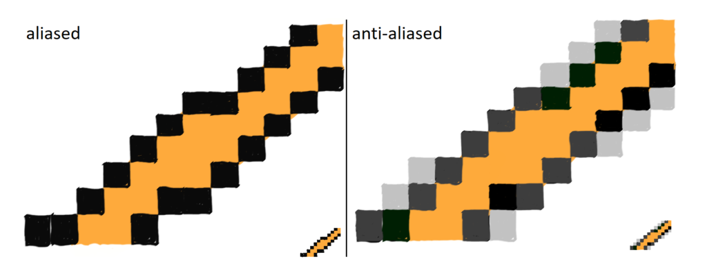 Figure 6. An example of aliased (left) and anti-aliased (right) line, with zoomed out versions in the bottom left corners.