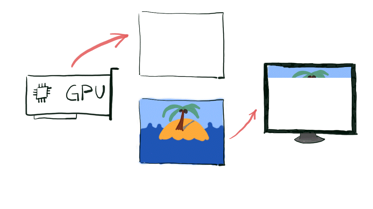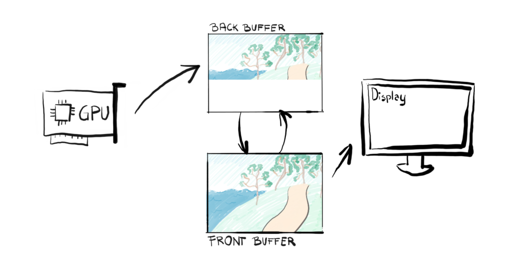 One of the solutions for screen tearing problem is actually pretty simple – what if we had two separate surfaces in memory? One will be used by the monitor to read the current frame datafrom, while the other would be used by the GPU to produce the next frame. When both GPU and display are done, we can simply switch the pointer and we are ready for the next iteration.