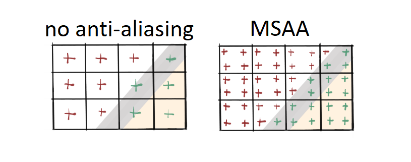 One of the techniques to prevent geometrical aliasing is called Multi-Sampling Anti-Aliasing, or MSAA for short. The bottom-line of this technique is this – instead of testing coverage at the center of the pixel, you test it in some defined number of points, so kind of testing on a sub-pixel level. If you talk about 4x MSAA, you test at four sub-pixel locations, and so on. This is showed on the right side of figure 7. MSAA yields better results but it is significantly slower.