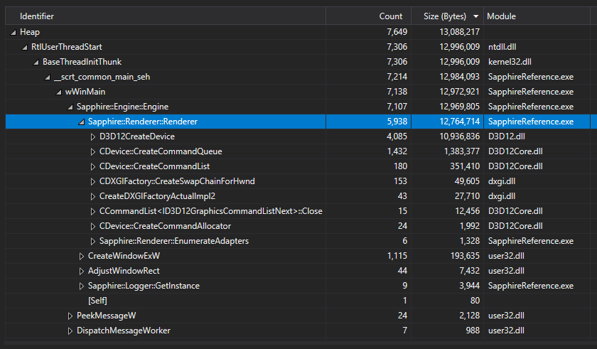 In the Renderer constructor, the biggest allocators were D3D12CreateDevice (10MB from D3D12.dll), followed by 1.5MB allocated by the CDevice::CreateCommandQueue from D3D12Core.dll module. Also, at the bottom there is a line that says “[Self]” – it represents the allocations for the Renderer class itself. We only created one instance and it took about 80 bytes. We store all of our Renderer class members in there.