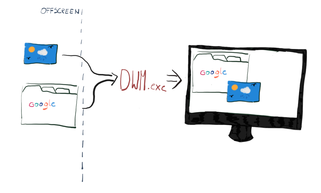 Figure 5. Desktop Window Manager composes windows. Each application renders to its own offscreen surface and DWM puts that all together to produce desktop image.